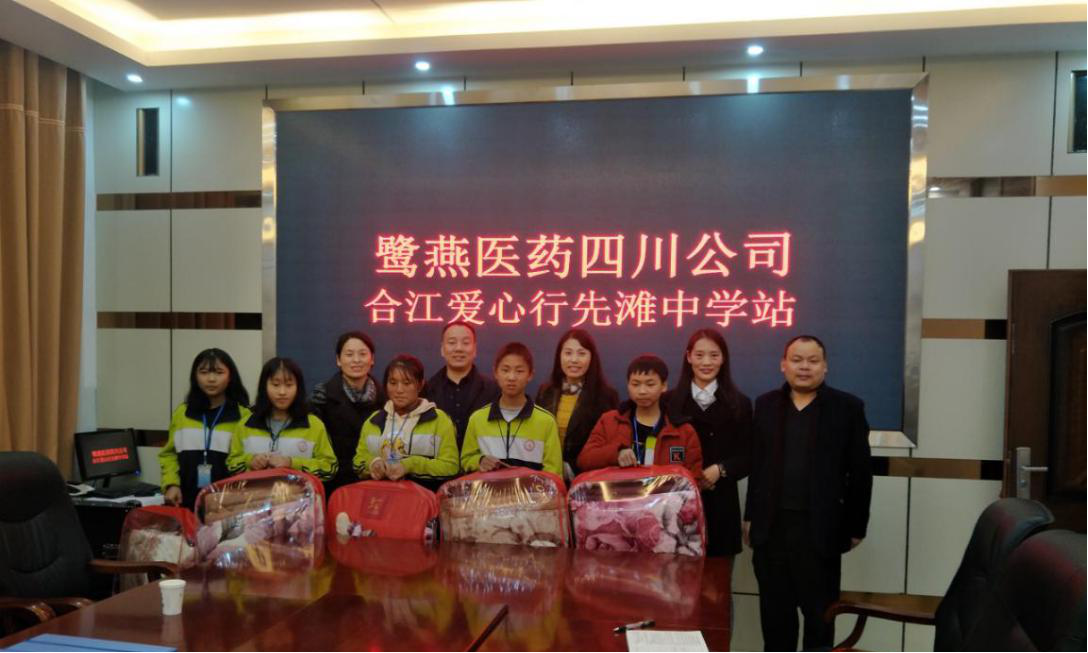 由鹭燕医药四川省运管中心、成都禾创药业等成员公司的领导、员工代表组成的爱心小组先后走访了拥有百年悠久历史的合江中学、先滩中学、自怀镇中心校等学校,慰问了受帮扶的学生,并与其家长、学校相关领导和老师进行交流,深入了解孩子们的学习、生活情况,同时送去了助学金和慰问品。