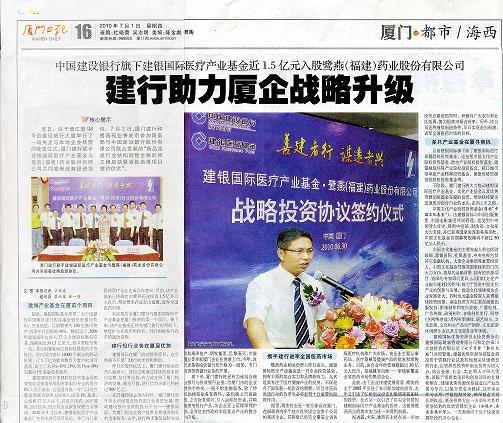 鹭燕(福建)药业股份有限公司与建银国际医疗产业股权投资有限公司于2010年6月30日在厦门签署战略投资协议。